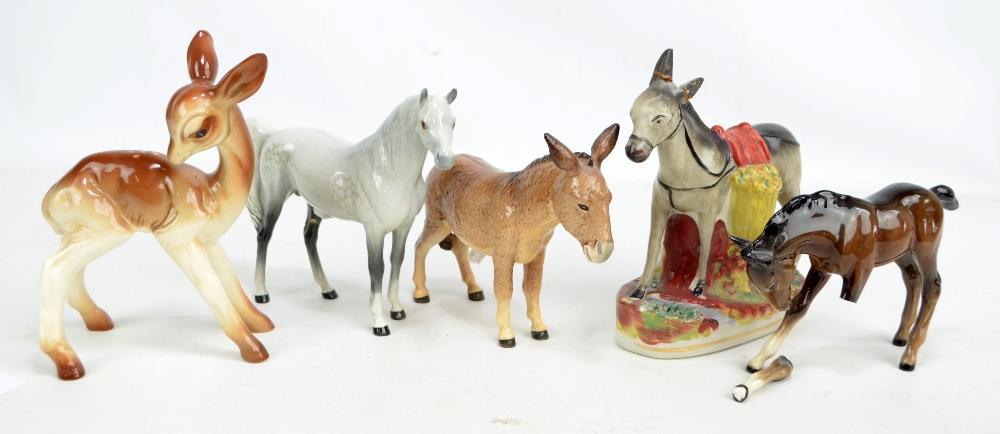 Lot 336 of 1213: BESWICK; a dappled grey horse, a smaller brown example (af), a donkey and a fawn, also a Staffordshire figure of a donkey (5).