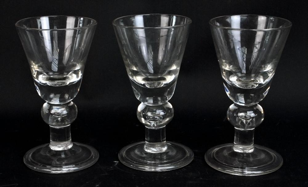 Lot 546 of 1213: Three heavy clear glass rummers with tears to stems on spreading circular feet, height of each approx 15.5cm (all af) (3).