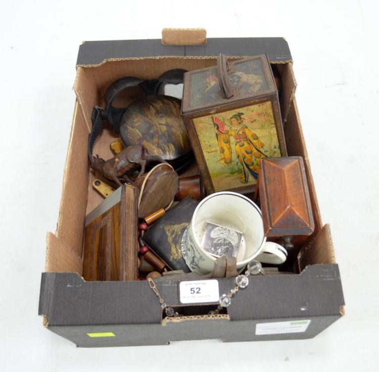 Lot 52 of 1991: A mixed lot of collectors' items including a perpetual date calendar, a pair of goggles, a Black Forest carved figured of an ibex and a lacquered box.