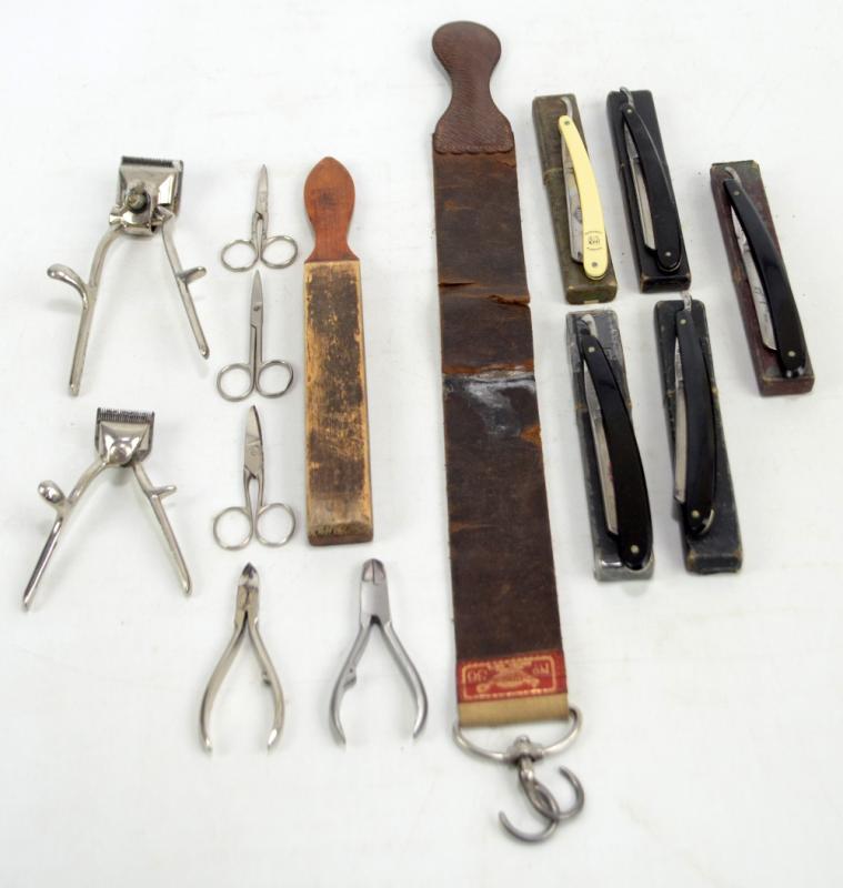 Lot 54 of 1991: A small collection of vintage straight razors complete with wooden and leather strops, nail clippers, and further gentleman's grooming equipment.