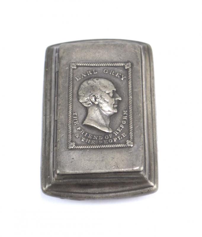 Lot 56 of 1991: A rectangular metal snuff box with bust and motto 'Earl Grey The Friend of Reform & The People' to top, 7.5 x 4.5 x 1.5cm.