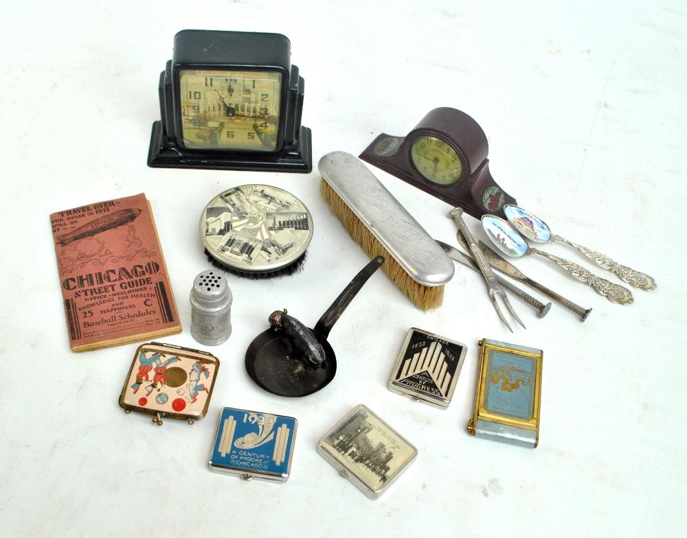 Lot 65 of 1991: CHICAGO 1933; two mantel timepieces, a street guide, four compacts and a brush, also Buffalo 1901, a brush, miniature frying pan, commemorative spoons, small tin and two knives and a fork constructed from nails.