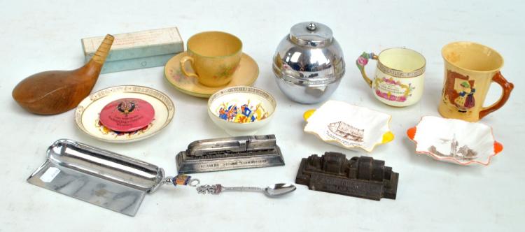 Lot 66 of 1991: GLASGOW 1938; a group of collectors' items including a golf club head inscribed 'Empire Exhibition 1938, John Littons', a globular tea canister, an advertising desk weight, also two Shelley butter dishes and a small group of ceramics.