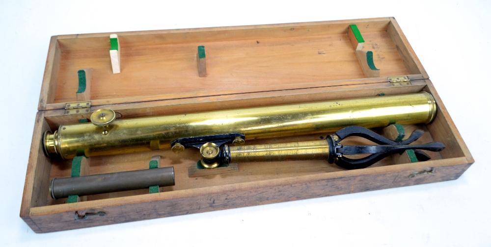 Lot 119 of 1991: A cased 1.5'' brass unnamed single draw telescope, with iron and brass tripod and additional lens, length 63cm.