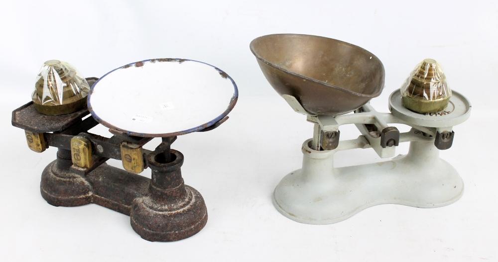 Lot 128 of 1991: Two sets of cast iron balance scales, one with an enamel pan, height 15.5cm, both with a set of seven brass weights (2).