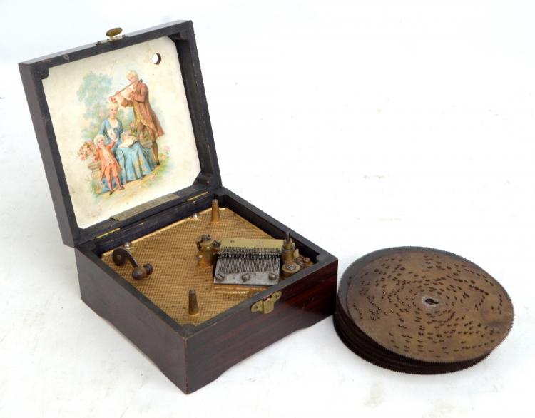 Lot 259 of 1991: A late 19th century simulated rosewood cased symphonion with transfer decoration to the hinged lid, inscribed 'Symphonion Brevetй-Patent', with interior figural print, width 17cm, with sixteen discs.