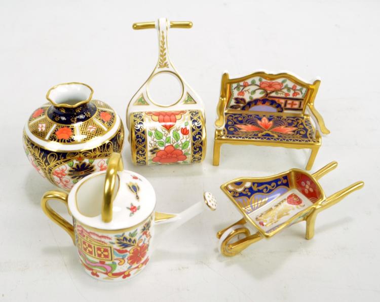 Lot 513 of 1991: Five Royal Crown Derby miniatures including a watering can, roller and a wheelbarrow (5).