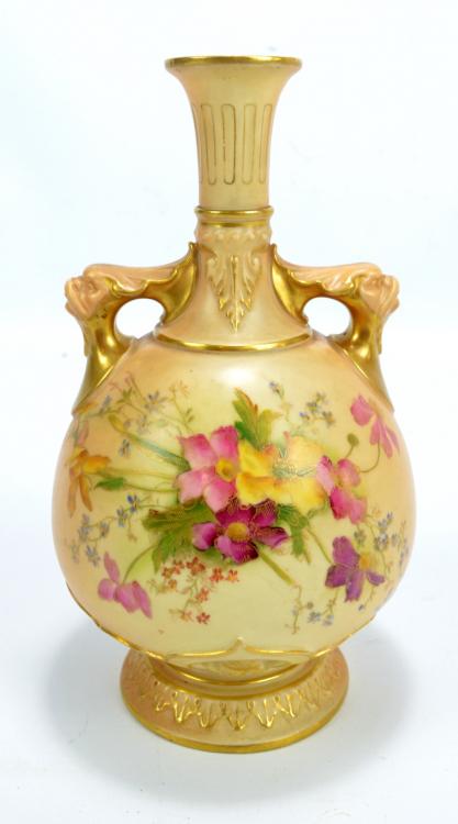 Lot 516 of 1991: A Royal Worcester blush ivory porcelain vase of globular form with slender waisted neck and stylised mask twin handles, painted with floral sprays, on spreading mould decorated base, marked in puce, date code for 1910, no.162, height 23cm.