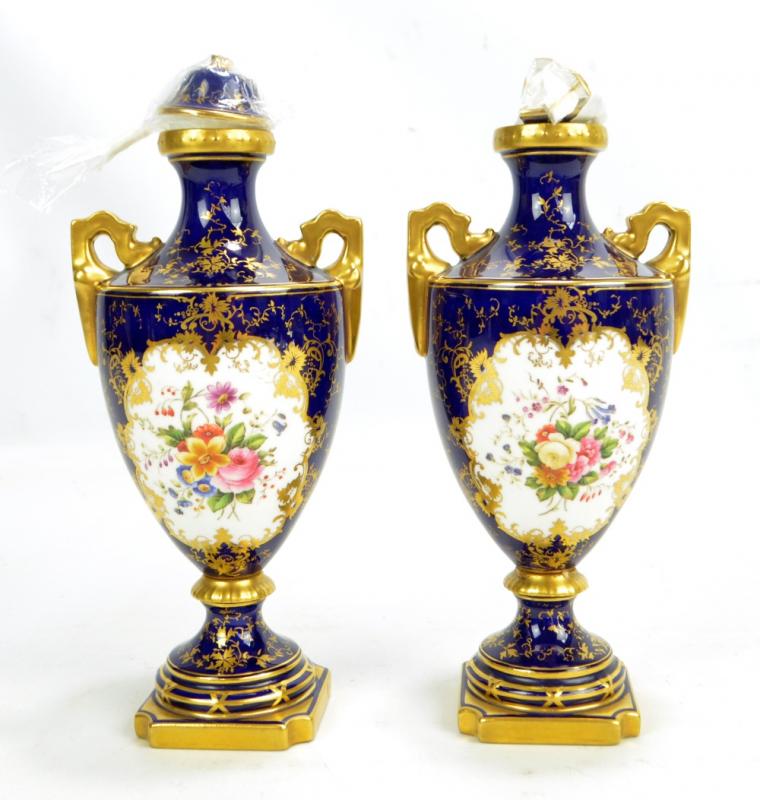 Lot 523 of 1991: A pair of Coalport twin handled urns painted with floral panels on gilt blue ground, no.7730, height of each approx 21.8cm (lids present but af) (2).