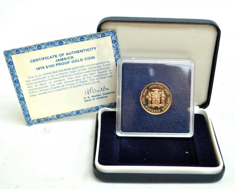 Lot 1269 of 1991: A Jamaica 1979 $100 0.900 gold standard proof coin, one hundred and seventy-five grains, encapsulated and cased with certificate.
