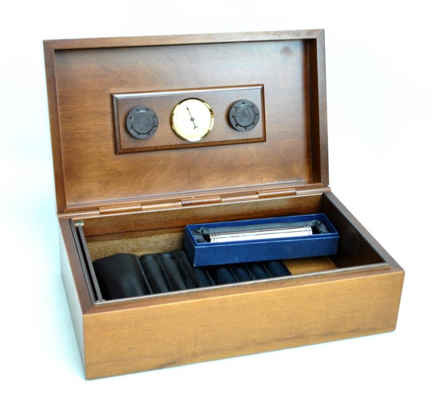 Lot 20 of 2312: A Lubinsky walnut humidor with figured top, 35 x 21cm, three leather cigar pouches and a chromed telescopic example (5).