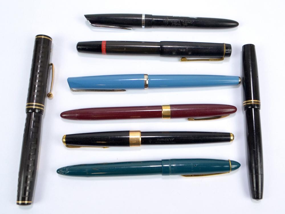 Lot 36 of 2312: Four fountain pens with 14ct gold nibs, by Parker, Sheaffer, Wahl and Pitman's 'Fono' by Waterman, three further fountain pens and a rapidograph (8).
