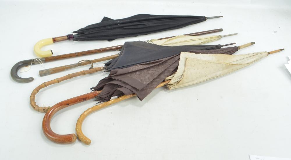 Lot 52 of 2312: Five umbrellas and parasols and a horn handled walking stick with hallmarked silver collar, length 91cm (6).