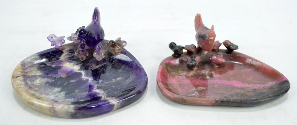 Lot 57 of 2312: An amethyst oval pin dish decorated with hen and five chicks (one missing), width 12cm, and a smaller quartz dish (af) (2).