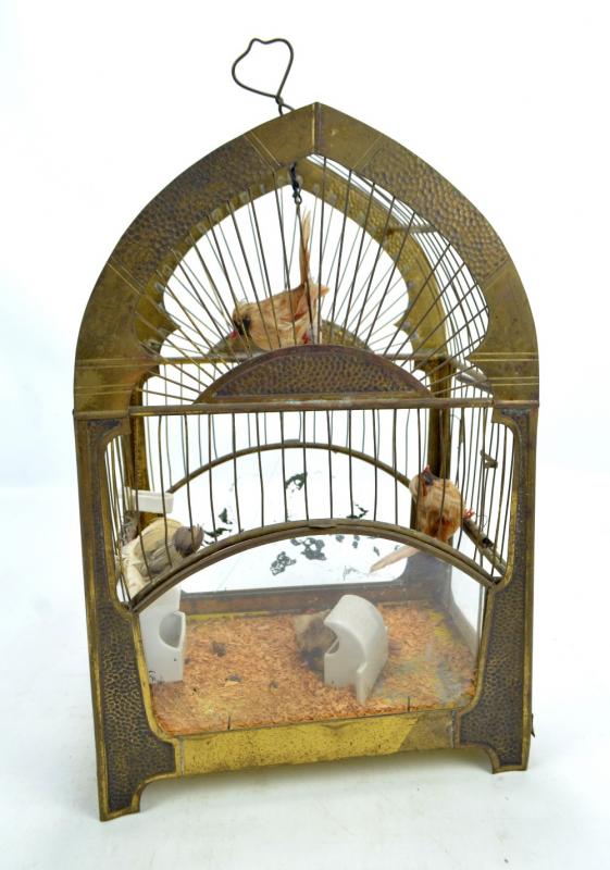 Lot 60 of 2312: An Arts and Crafts style hammered brass bird cage with lancet top and glazed sides, with four birds and three ceramic feeders, height 43cm.
