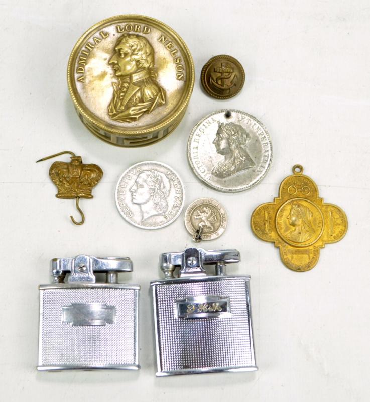 Lot 73 of 2312: A commemorative Admiral Lord Nelson trinket box, a Queen Victoria 1897 jubilee pendant, a Kriegsmarine button, two Ronson lighters etc.