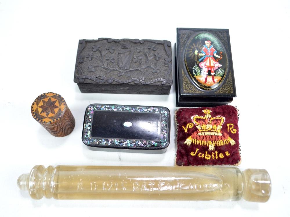 Lot 74 of 2312: An Irish bog oak rectangular snuff box, a Victorian papier-mвchй mother of pearl inlaid snuff box, a Russian lacquered box and a cylindrical example with parquetry inlaid top, pin cushion and a 1915 fire grenade (6).