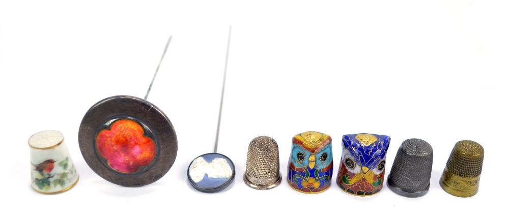 Lot 75 of 2312: Six thimbles including a boxed silver example by Charles Horner, 1892, a Royal Worcester porcelain thimble and two cloisonnй enamel decorated owl shaped thimbles, and two hat pins, one stamped ''Queensway'' (8).