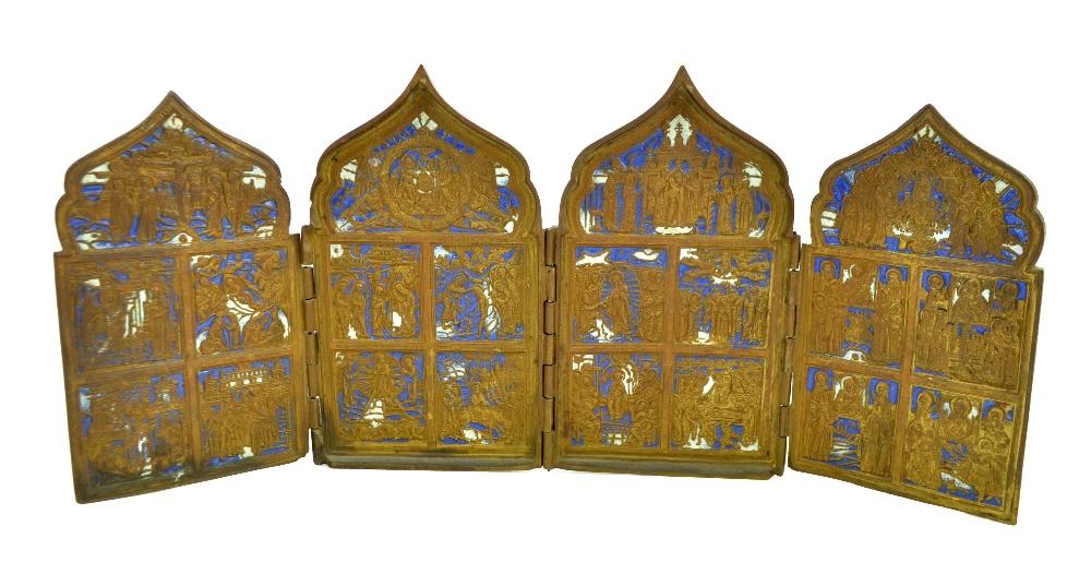 Lot 76 of 2312: A 19th century Russian brass and enamel four panel travel icon, width 40cm.