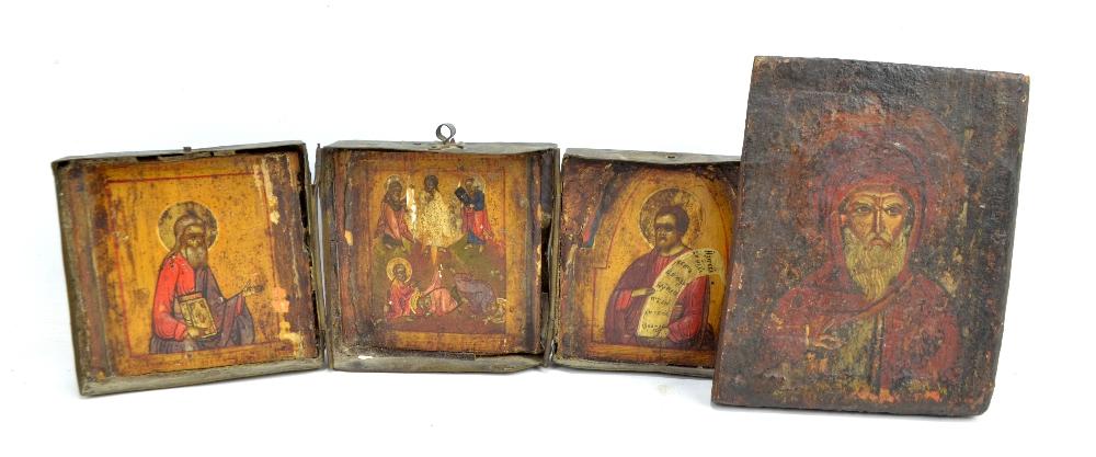Lot 77 of 2312: A 19th century Greek brass mounted triptych, the central panel depicting the Ascension, width 26cm, and a tempera panel depicting a saint (2).