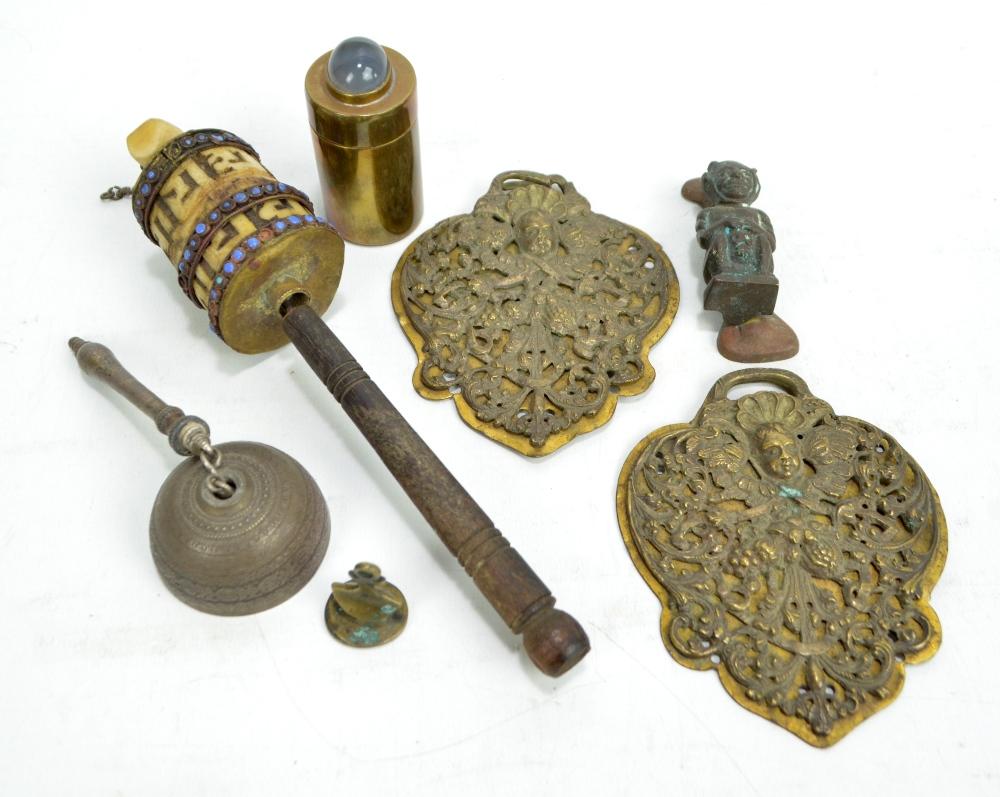 Lot 78 of 2312: A mixed lot of collectors' items including a Tibetan prayer wheel, a pair of Continental pierced brass plaques/mounts, etc (7).