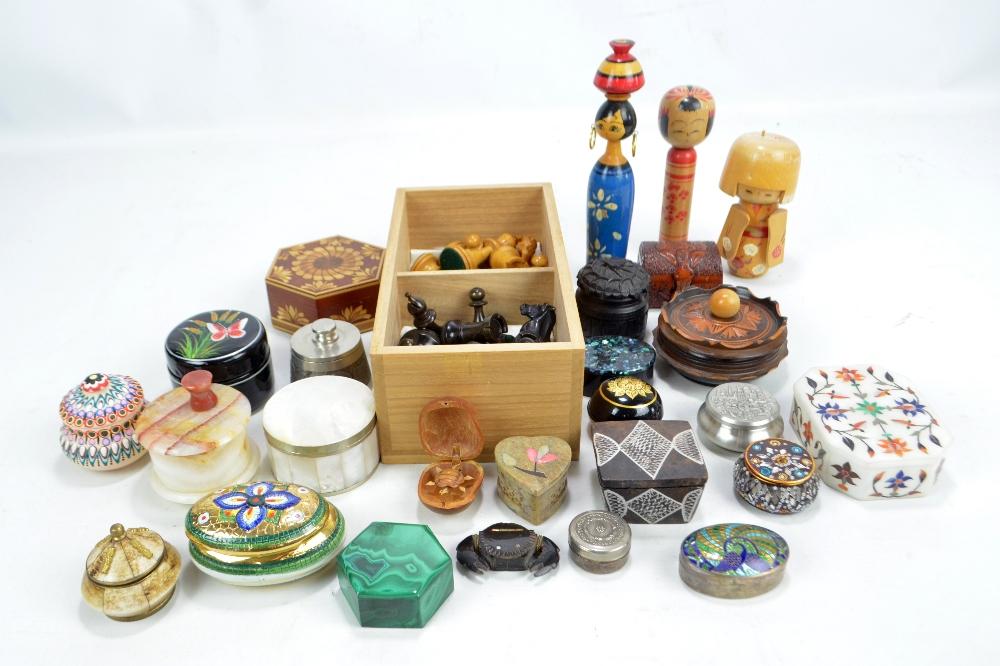 Lot 79 of 2312: A small collection of trinket boxes to include pietra dura floral decorated example and an Irish oak and malachite box, also three Oriental wooden toys and a chess set (one rook missing).