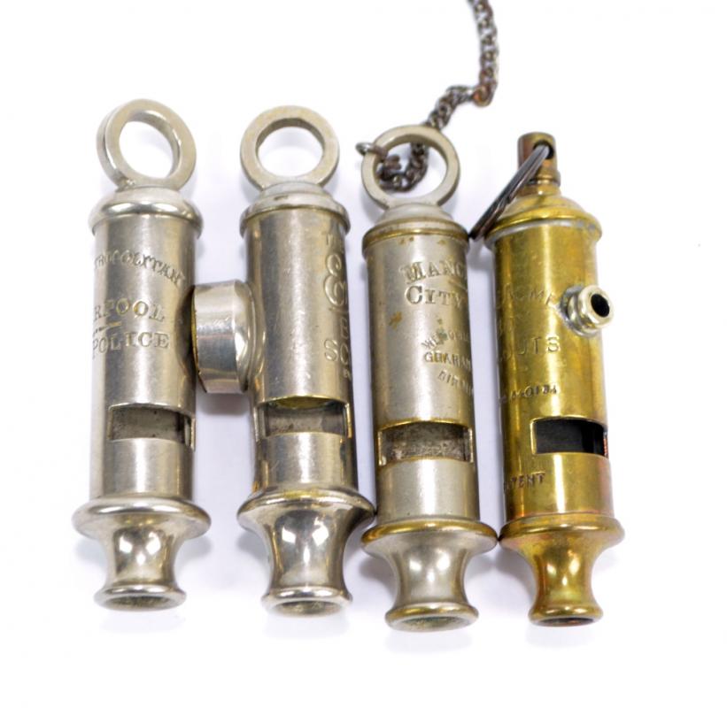 Lot 81 of 2312: Two Boy Scout's whistles, one with attached compass, and two further Liverpool and Manchester City Police examples (4).