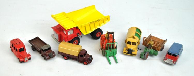 Lot 238 of 2312: Eight loose Dinky diecast haulage/transportation vehicles comprising 'Aveling-Barford Centaur Dump Truck', 'Bedford' (x2), 'Fire Engine' (lacking ladder), 'Austin' (x2), 'Coventry Climax Fork Lift Truck' and 'Motocart' (8).