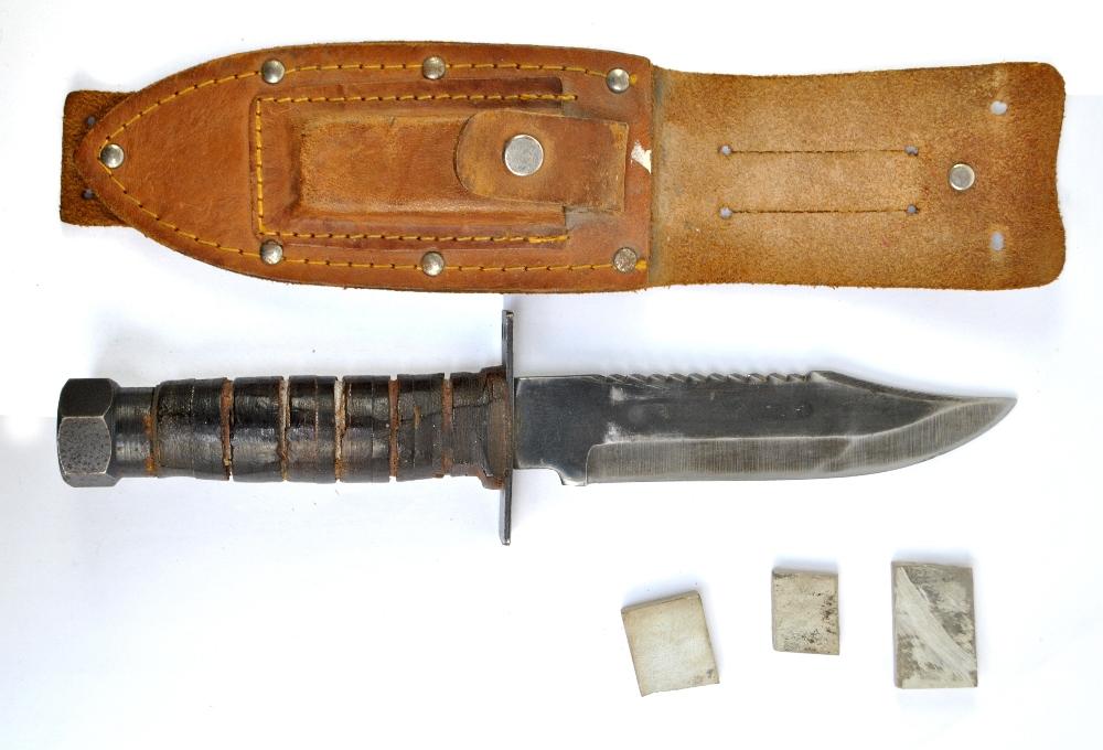 Lot 419 of 2312: A private purchase Japanese manufacture jet pilot survival knife, stamped 'Japan' to blade base, length 24cm, in leather scabbard.