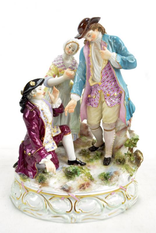 Lot 704 of 2312: A Meissen porcelain figure group depicting a kneeling man and woman pleading with a gentleman, on naturalistic encrusted base, marked underneath, no.B100, height 22.5cm (af).