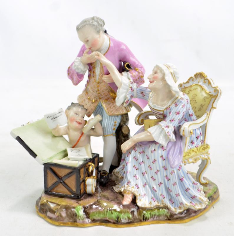 Lot 705 of 2312: A Meissen porcelain figure group depicting a gentleman kissing the hand of a seated woman and a young faun with chest of scrolls and letters, marked to base, width 13cm (af).