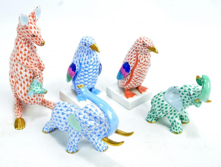 Lot 719 of 2312: Five Herend porcelain figures of animals including a kangaroo, height 15cm, and penguins, height 11cm (5).