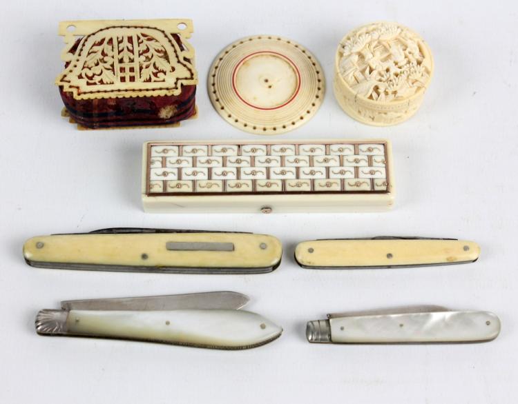 Lot 51 of 1757: A group of ivory and bone items to include a late 19th century toothpick case with mirrored hinged lid decorated with gold inset brick pattern panels, length 8.5cm, and a carved Chinese Canton circular pill box, also four pen knives to include two silver bladed mother of pearl handled examples (8).