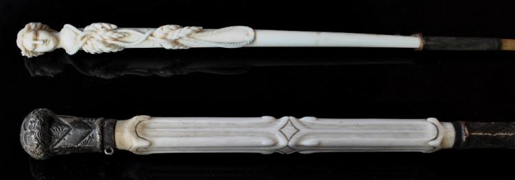 Lot 52 of 1757: A late 19th century ivory topped whip, the finial in the form of a female head with carved rope detail, length 75cm and a further silver mounted example (maker's mark rubbed), London 1890, (2).
