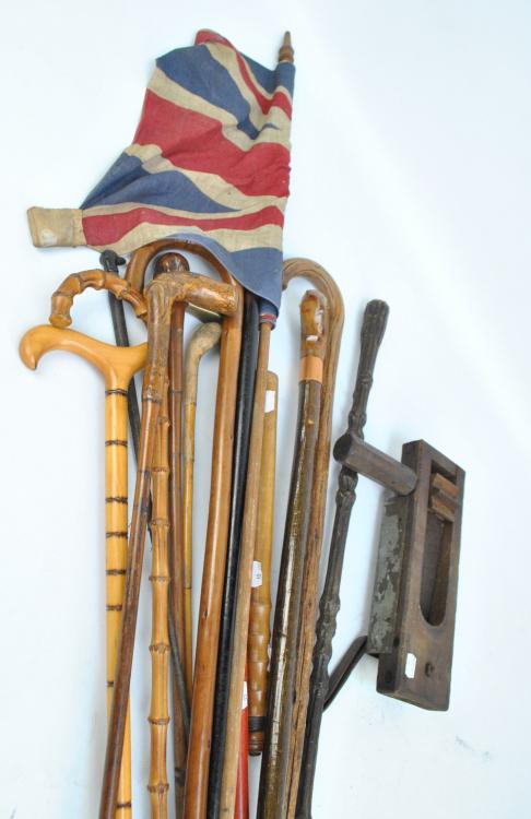 Lot 55 of 1757: A collection of walking sticks and canes including a horn dogs head handled silver collared example, bamboo canes, a gnarled example, a dog headed crop, also a Union flag centred with royal crest, a truncheon and a large rattle.