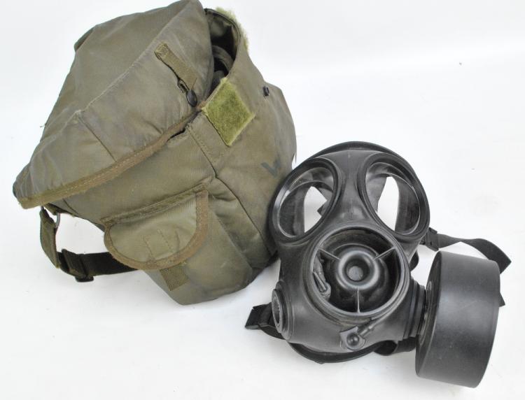 Lot 467 of 1757: A rubber gas mask with twin side screw on sections and complete with outer case, the case inscribed 'Haversack respirator NBC S6 MK2, 1980' and bearing military broad arrows.