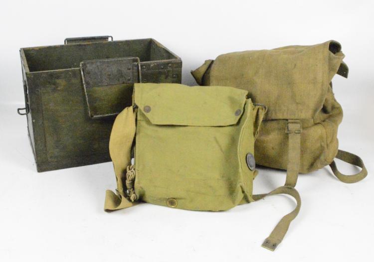 Lot 469 of 1757: A WWII wooden Sten gun box, a haversack, a gas mask, ammunition bag and a shoulder pouch (5).