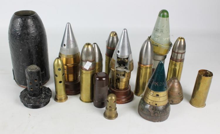 Lot 475 of 1757: A group of shells and heads including a 1953 fuse plus a similar cutaway example, a no.85 fuse, etc.