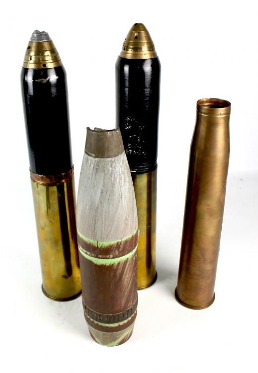 Lot 476 of 1757: An 18 pounder shell and case, a similar 18 pounder shell and case, a British WWII six pounder shell case dated 1943 CWT and a 105 Howitzer shell (4).