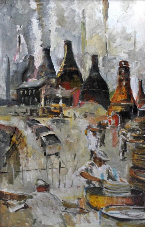 Lot 839 of 1757: FREDERICK J ENGLAND; oil on canvas, 'Drama of the Opening of the Saggars', signed and titled verso, 111 x 61cm, framed and glazed (D).