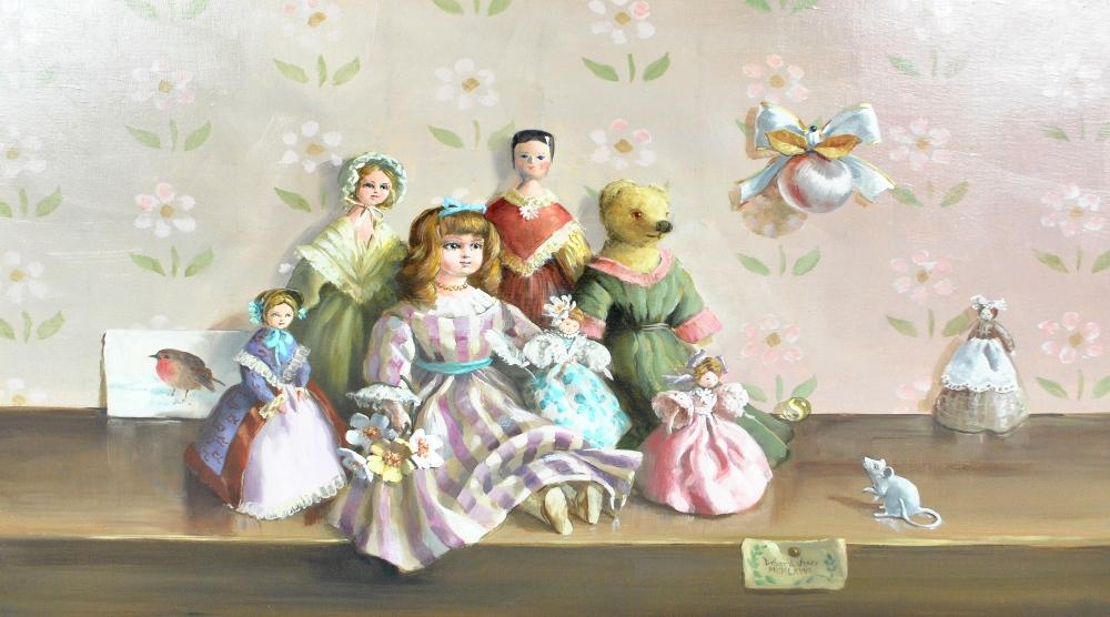 Lot 845 of 1757: DEBORAH JONES (1921-2012); oil on canvas, 'Still Life with Dolls & Teddy Bear', signed and dated '75, 55 x 75cm, framed (D).