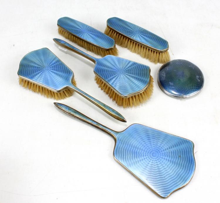 Lot 102 of 2052: A base metal and blue enamelled six piece dressing table set comprising mirror, pair of clothes brushes, a pair of hand brushes and compact.