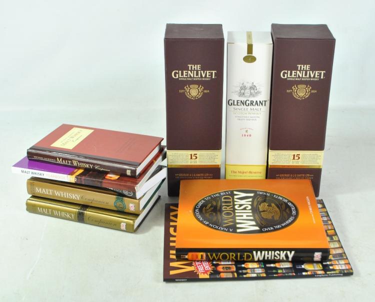 Lot 470 of 2052: Three bottles of single malt Scotch whisky comprising The Glenlivet French Oak Reserve Aged 15 Years, 70cl 40% (x2) and Glen Grant The Major's Reserve, 70cl 40%, all boxed and with several books on whisky.