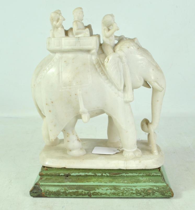 Lot 580 of 2052: An alabaster figure of an Indian elephant and riders, raised on associated painted wooden plinth, height 31cm.
