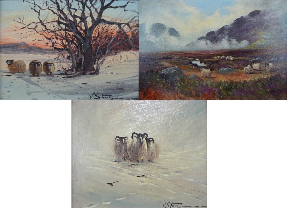 Lot 943 of 2052: JIM STURGEON (Scottish, 1931-2006); three oils on board depicting sheep with the largest in a highlands setting, all signed lower right, the largest approx 50 x 75cm, all framed (3). (D)