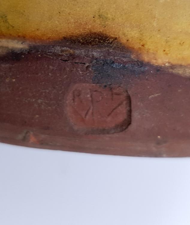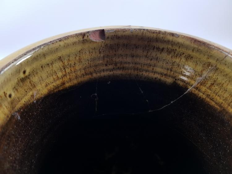 Lot 32 of 523: RAY FINCH (1914-2012) for Winchcombe Pottery; a early large slipware baluster vase covered in yellow glaze with iron floral decoration, impressed RF and pottery marks, original price of 42/- in pencil, height 31.5cm (af). (D)