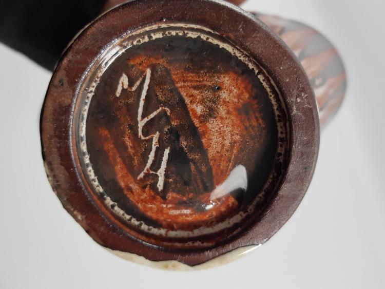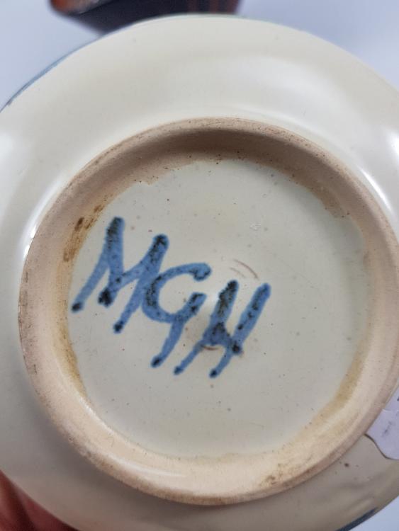 Lot 51 of 523: MARY GIBSON-HORROCKS (born 1923); a fan-shaped stoneware vase with incised decoration, incised MGH mark, height 14.5cm, and a small dish with iron and cobalt brushwork on a cream ground (2). (D)