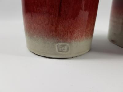 Lot 237 of 523: EDDIE CURTIS (born 1953); three cylindrical porcelain jars and covers predominantly covered in copper red glaze, impressed EC marks, tallest height 26.5cm (3). (D)