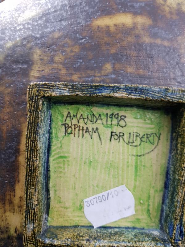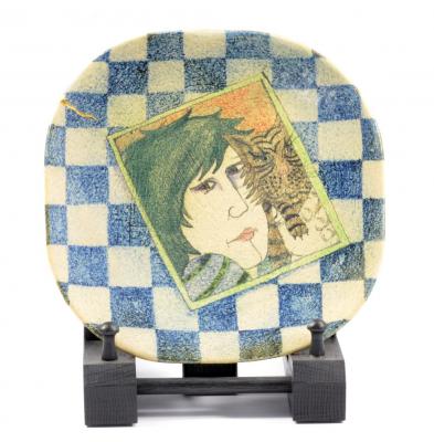 Lot 240 of 523: AMANDA POPHAM (born 1954) for Liberty; an earthenware plate decorated with a woman's face and cat on a checkerboard ground, painted signature and date of 1998, diameter 19.5cm. (D)