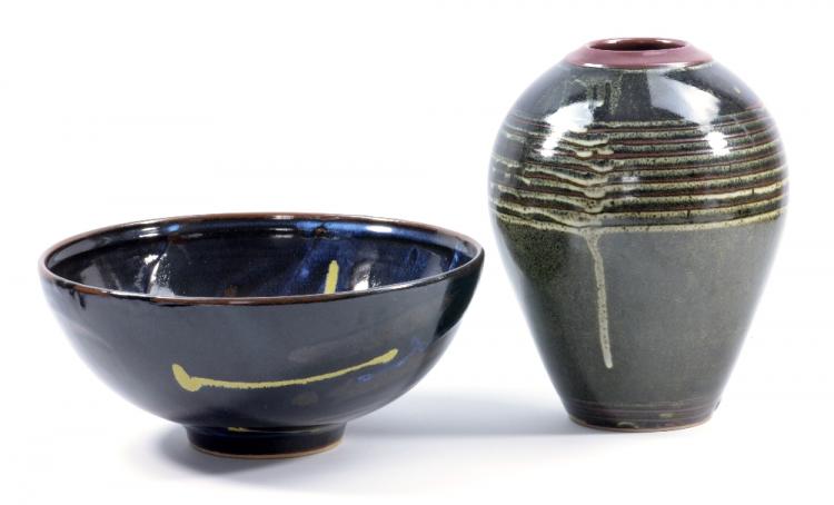 Lot 245 of 523: ANDREW CROUCH (born 1955); a stoneware vase and bowl, various glazes, impressed AC marks, vase height 24cm (2). (D)